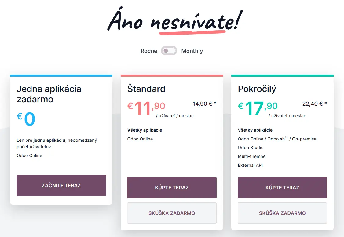 Odoo ponúka možnosť mesačných platieb za cloudový systém. Využívate tak všetky výhody ERP systému za zlomok provotnej investície.