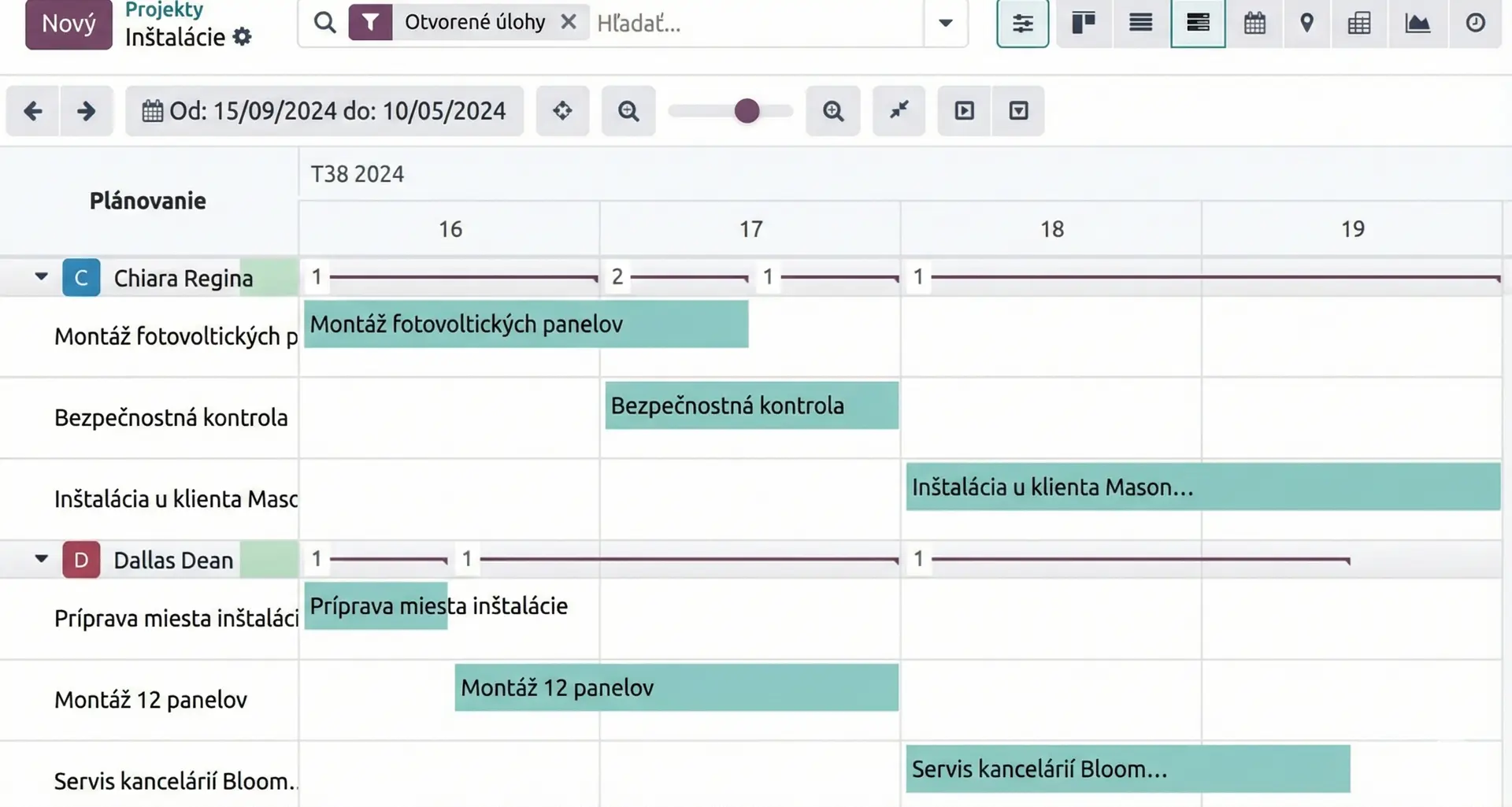 Jednoduchý manažment kapacít. Rozvrhnite prácu svojho tímu v prehľadnom Ganttovom diagrame pomocou funkcie „drag-and-drop“. Ak chcete ušetriť ešte viac času, využite inteligentné automatické plánovanie, ktoré Odoo spracuje za vás.