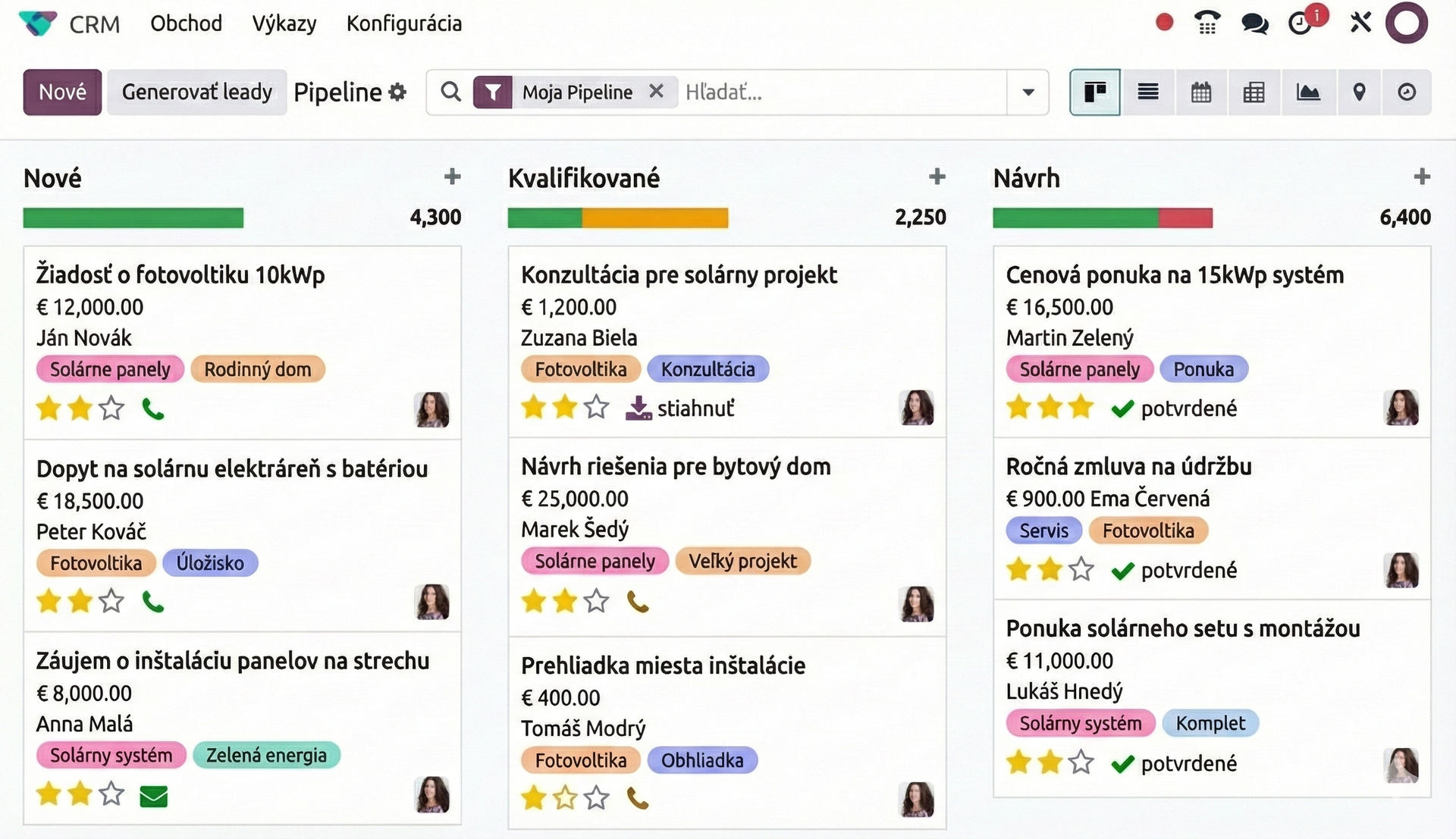 Odoo ERP integruje obchodné a realizačné procesy tým, že automaticky premieňa uzavreté obchody na inštalačné projekty s technickými detailmi dostupnými technikom priamo v teréne. Efektívny manažment montážnych tímov cez vizuálne plánovanie dopĺňa inteligentnou automatizáciou fakturácie podľa míľnikov, čím chráni cashflow firmy a zabezpečuje včasné úhrady záloh.