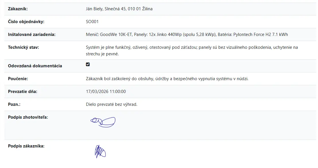 Hneď ako uzavriete predaj, systém automaticky vygeneruje potrebné inštalačné úlohy. Všetky dôležité údaje máte na jednom mieste, od špecifikácií produktov a časových odhadov až po kontaktné údaje klienta.